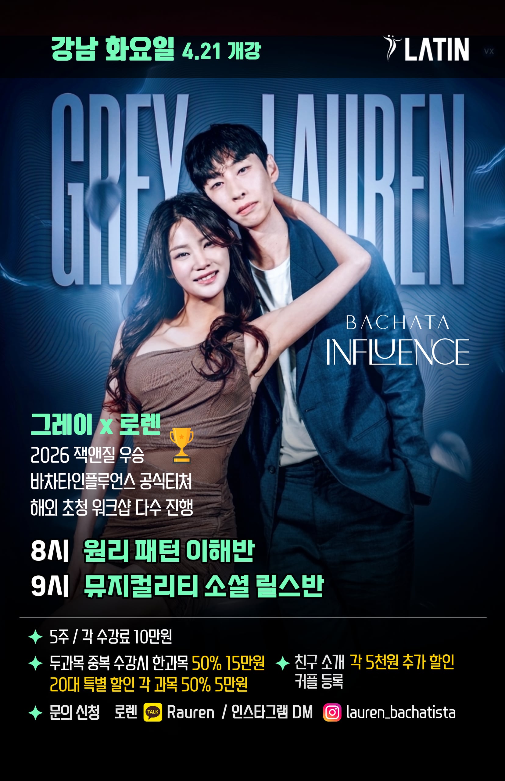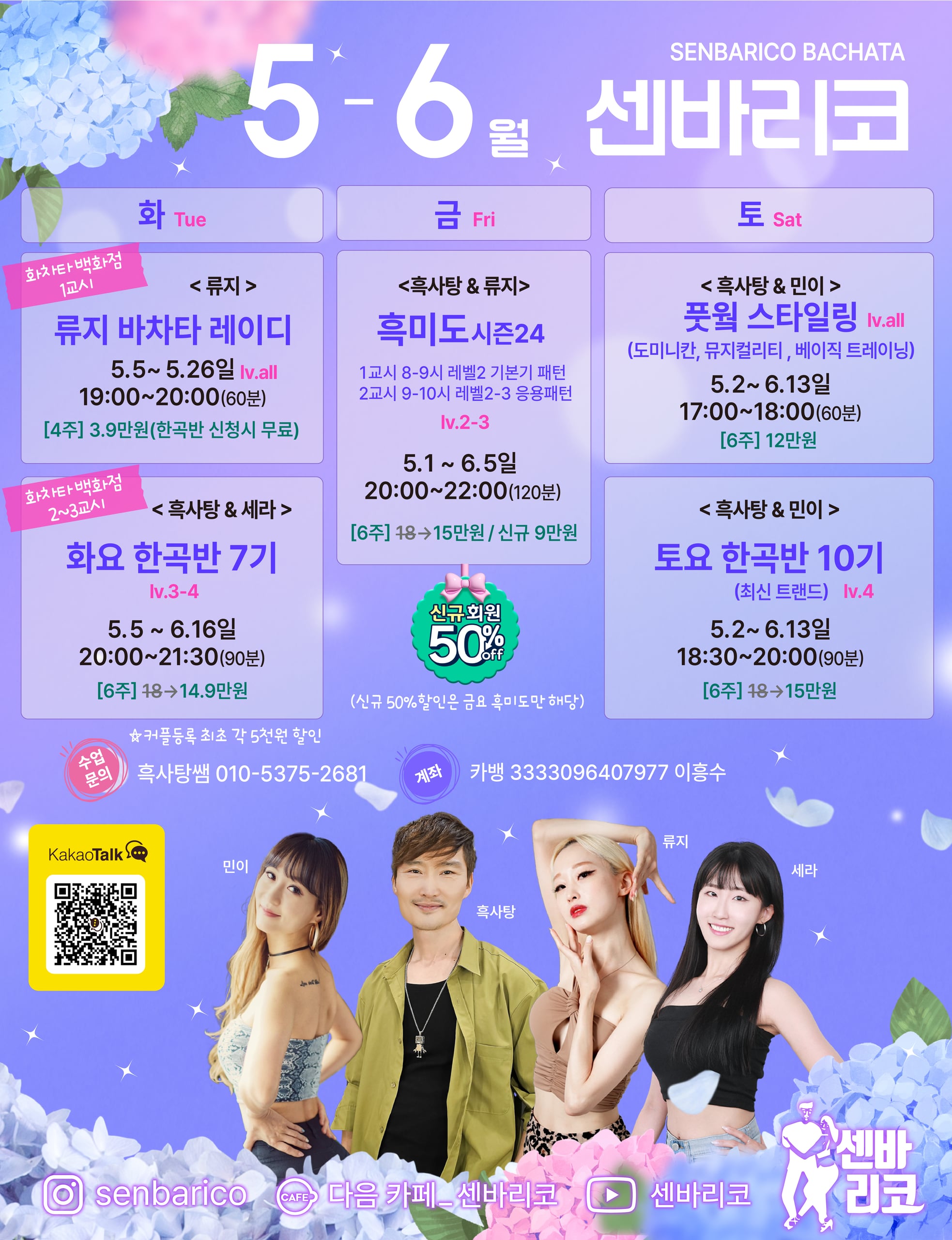 류지 바차타 레이디 개강 5/5화요 한곡반 개강 5/5흑미도 시즌24 개강 5/1풋웤 스타일링 개강 5/2토요 한곡반 개강 5/2
