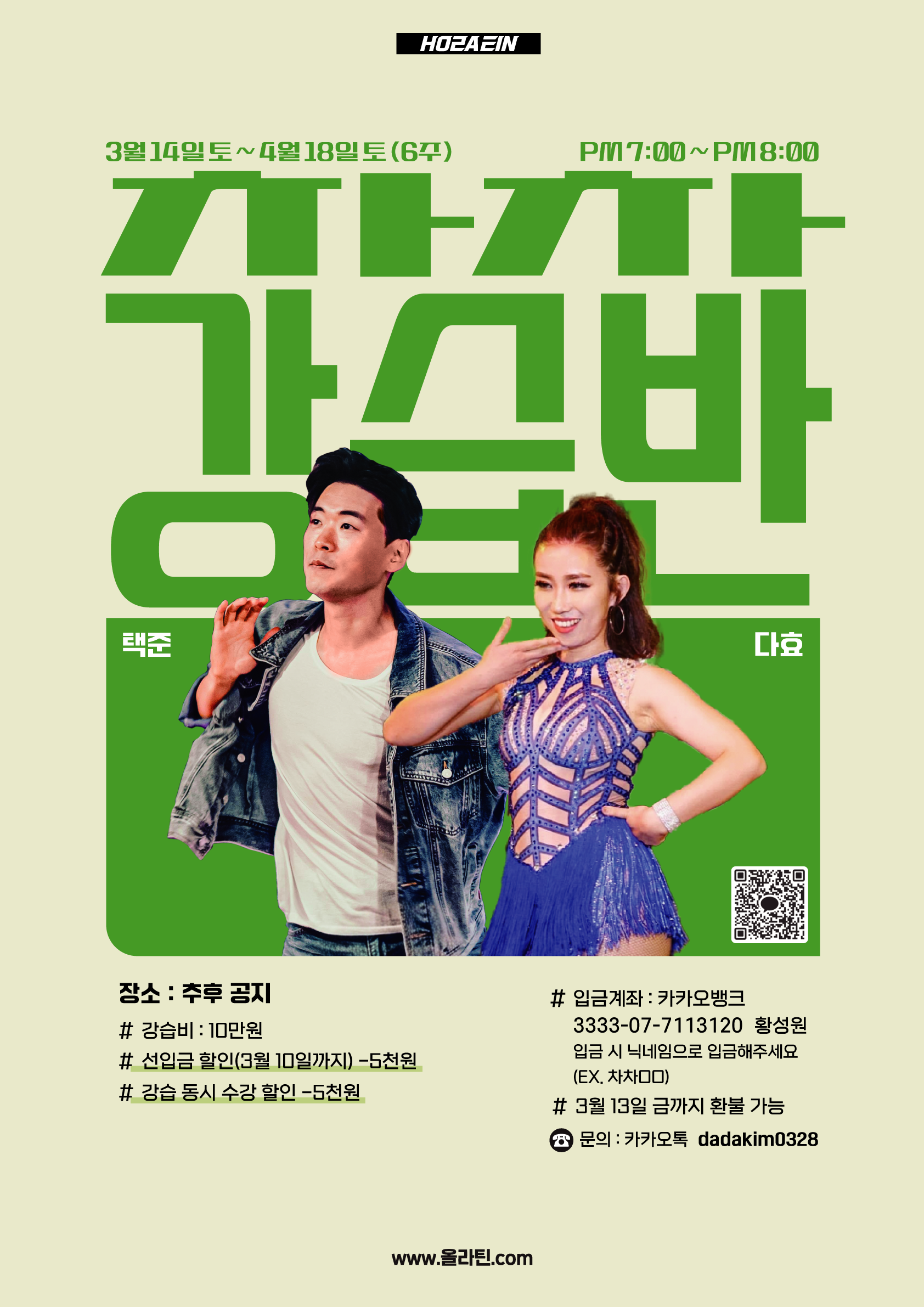 - 💃 [올라틴] 3월 신규 강습 신청 안내 🕺 안녕하세요! 올라틴입니다. 2026년 3월 강습 안내 입니다. 라인업이 확정되이번 달은 기초를 다지는 턴 베이직부터 화려한 바차타 공연반까지 어느 때보다 풍성하게 준비했습니다. 📅 강습 일정 안내 이번 3월 강습은 과목별로 종강일과 휴강 날짜가 각각 다릅니다. 수강 신청 전, 본인이 신청하시는 수업의 상세 일정을 포스터에서 꼭! 확인해 주시기 바랍니다. 개강일: 2026년 3월 14일 (토) 6주 과정 강습 장소: 추후 공지 예정 💰 할인 및 혜택 얼리버드 할인: 3/10(화)까지 선입금 시 5,000원 할인 중복 수강 할인: 강습 동시 수강 시 5,000원 추가 할인 ✅ 신청 및 입금 방법 입금 계좌: 카카오뱅크 3333-07-7113120 (황성원) 입금 명명: 수업+닉네임 (예: 초중급길동) 신청 링크: https://forms.gle/geQfxun9tJeGmxkn7