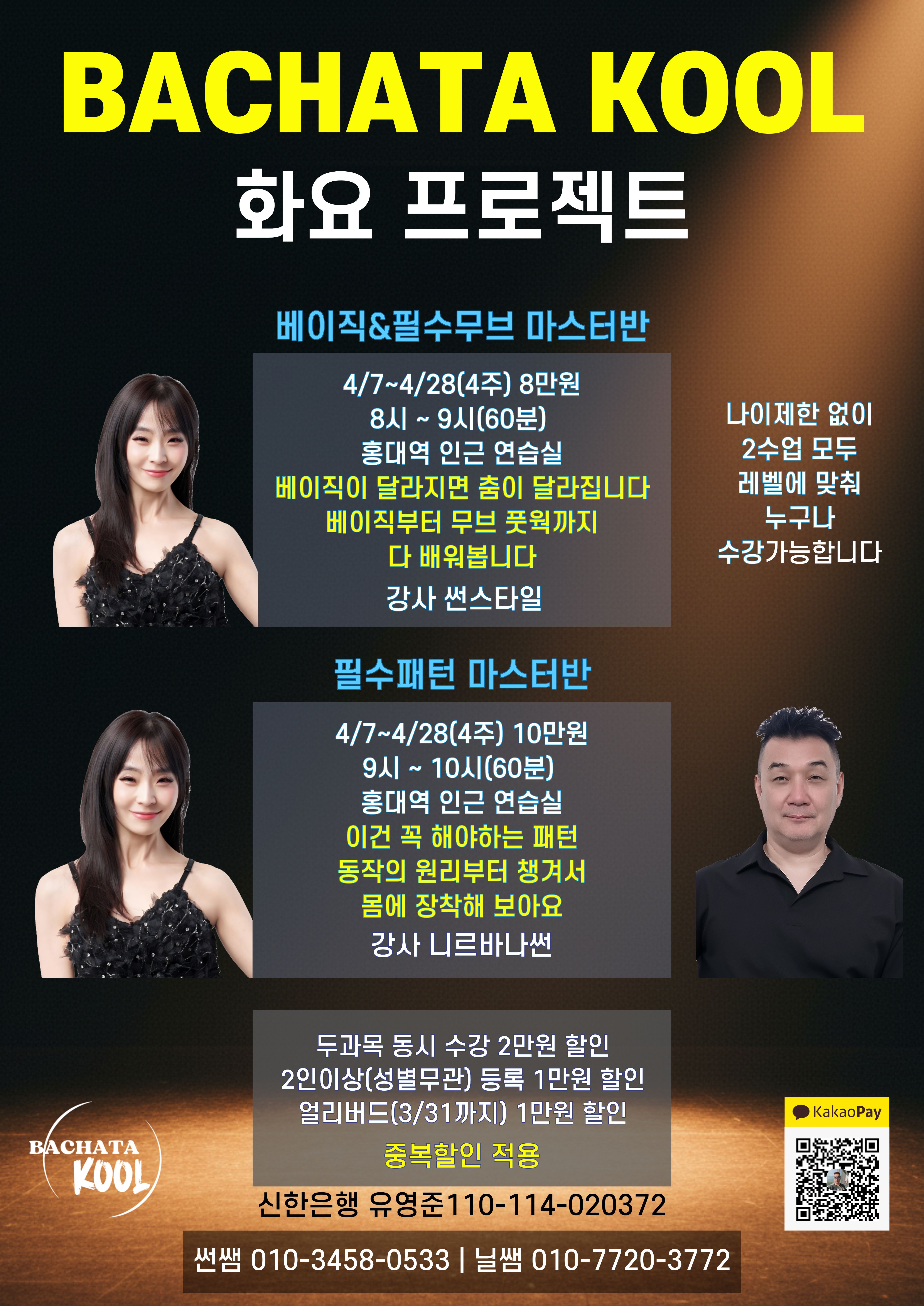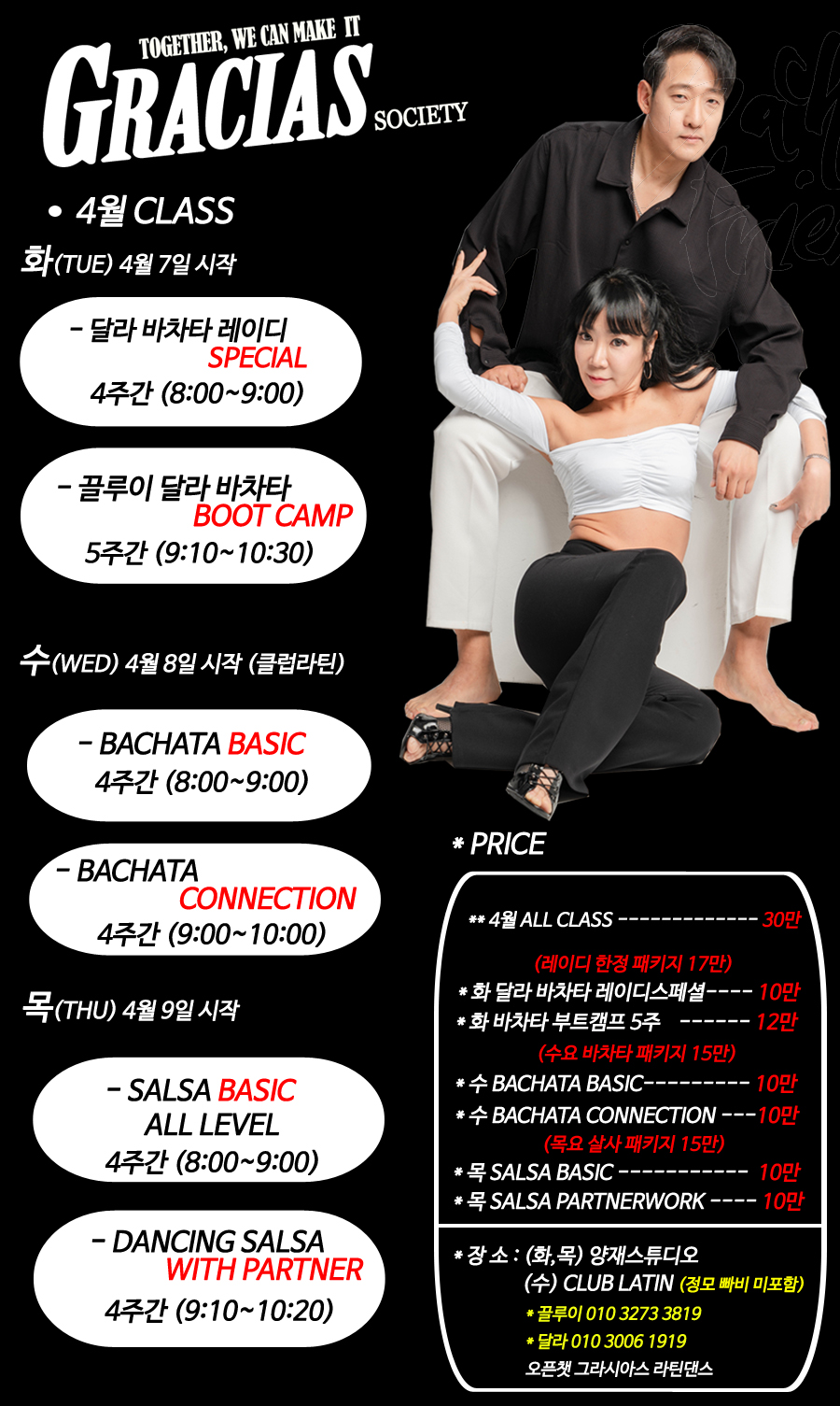 류지 바차타 레이디 개강 5/5화요 한곡반 개강 5/5흑미도 시즌24 개강 5/1풋웤 스타일링 개강 5/2토요 한곡반 개강 5/2